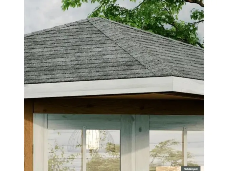 Eine Wandstärke von 28 mm macht die Konstruktion des Holzgartenhauses sehr stabil. Der passende Fußboden sowie die dazugehörigen Fundamenthölzer sind separat erhältlich. Das Dach aus Nut- und Federbrettern ist sehr robust und hält auch höheren Schneelasten im Winter problemlos stand. Aufgrund der speziellen Dachform als Spitzdach eignen sich hochwertige Dachschindeln besonders gut als Dacheindeckung – diese müssen zusätzlich erworben werden, da Monica ohne Dachpappe zur Ersteindeckung geliefert wird. Dank der Blockbohlenbauweise ist das Gartenhaus absolut wind- und regendicht. Dadurch sind auch widrige Witterungsverhältnisse kein Problem.