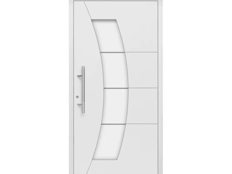 Die Haustür hat eine außen flügelüberdeckende Aluminiumfüllung mit wärmedämmender Energiesparfüllung und eingefrästen Nuten.
