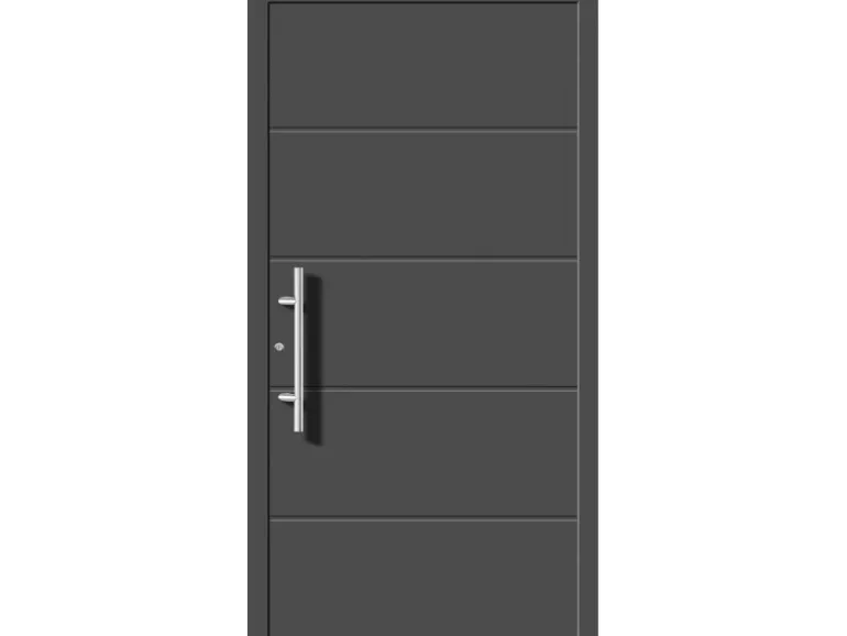 Die Haustür hat eine außen flügelüberdeckende Aluminiumfüllung mit wärmedämmender Energiesparfüllung und eingefrästen Nuten.