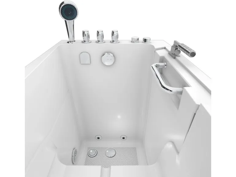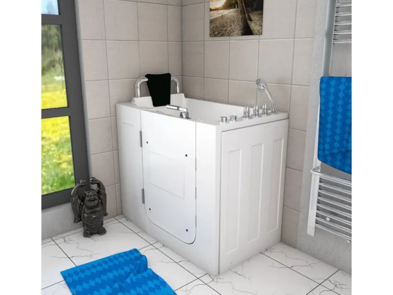 Die breite Türöffnung sowie der geräumige Einstiegsbereich, der integrierten Haltegriff und das anatomische Design des Wannenkörpers gewähren einen sicheren Halt und bieten Personen eine angenehme Bewegungsfreiheit.
