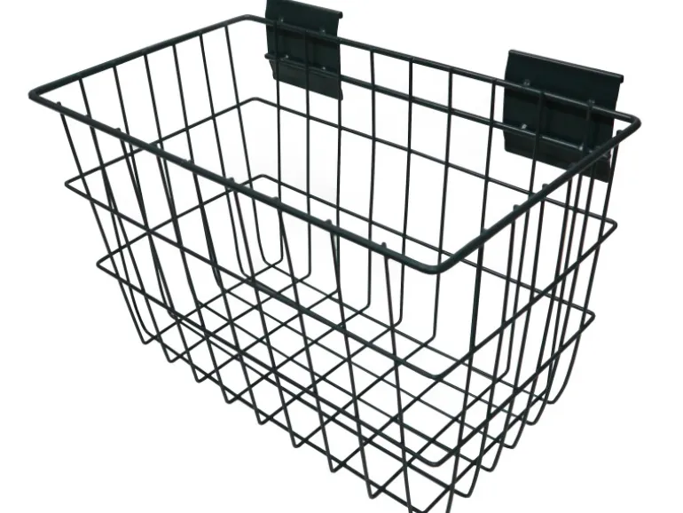 Der Rivet Stahlgitter Korb Anthrazit Grau wird an die längs oder Quertraversen der Rivet Regale aufgehängt.