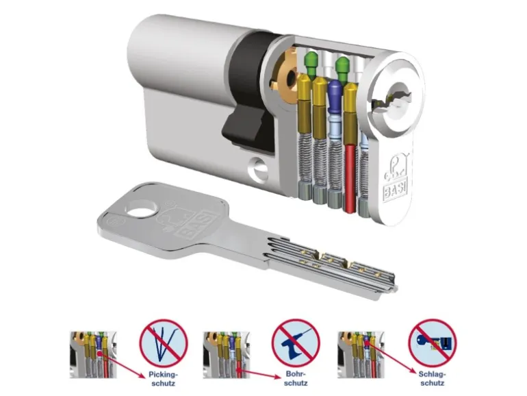 Der qualitätsvolle Profil-Doppelzylinder der Marke Basi mit Wendeschlüssel dient als sicheres Türschloss für Ihre Haus- oder Wohneingangstüre. Der Bohrmuldenzylinder besteht im Kern aus 8 direkten Sperrelementen auf 2 verschiedenen Ebenen und sorgt somit für mehr Sicherheit. Durch den zusätzlichen Picking-, Aufbohr- und Schlagschutz sorgt der Doppelzylinder für besten Schutz und erschwert es dadurch Einbrechern das Schloss gewaltsam aufzubrechen oder zu knacken. Der Profilzylinder ist mit einem verschiedenschließenden System ausgestattet. Das bedeutet, dass nur die 3 mitgelieferten Wendeschlüssel passend sind. Anhand des Codes auf dem Schlüssel können jederzeit Ersatzschlüssel bei Ihrem regionalen Schlüsseldienst angefertigt werden. Bei der Fertigung des robusten Zylinders wird ins besonders Wert auf höchste Qualität geachtet. Die präzise Herstellung und Prüfung erfolgt nach DIN Norm 18252/2006-12 / DIN 18252-10 / DIN EN 1303/2005-04 Reg. Nr. 34v05.