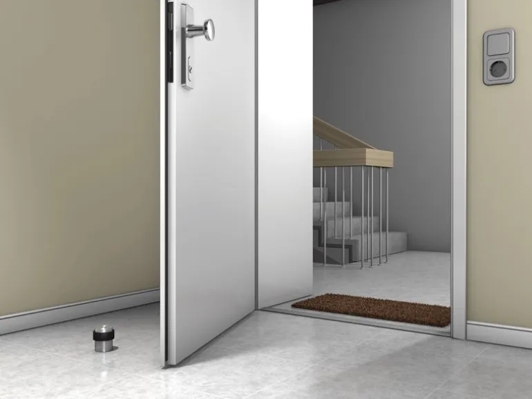 Boden-Türstopper von BASI. Der Boden-Türstopper kann fest auf dem Boden verankert werden und verhindert dadurch das Anschlagen der Türe an der Wand.