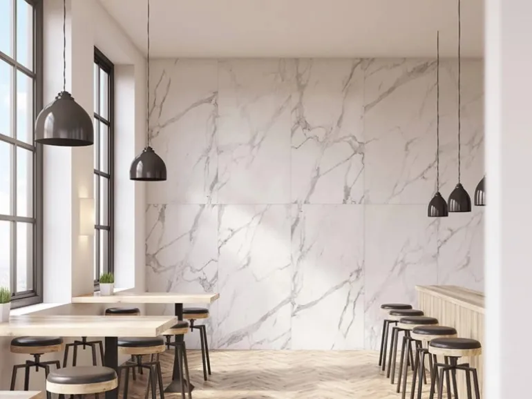 Marmorierte Optik in Weiß mit grauer Maserung für modernes Ambiente