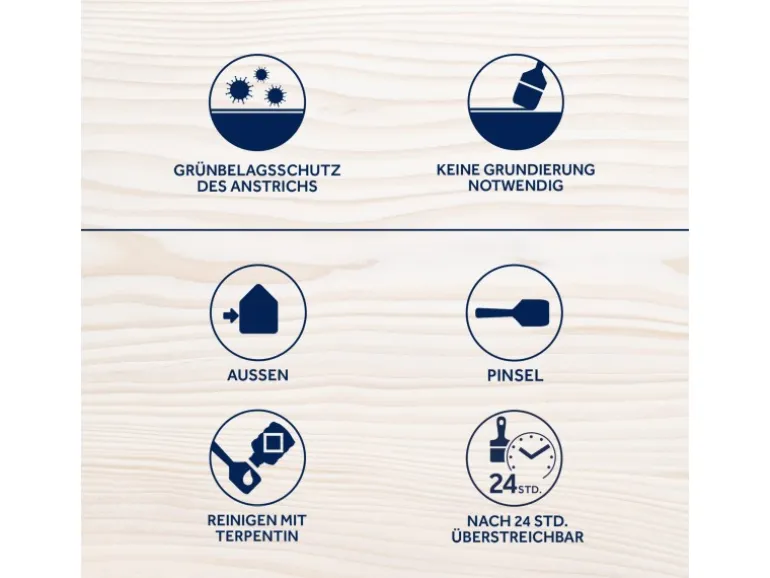 Die Holzoberfläche ist nach dem Anstrich wasser- und schmutzabweisend. Außerdem schützt die Lasur vor UV-Strahlen und somit vor vorzeitiger Vergrauung des Holzes. Durch die lösungsmittelhaltige Farbe bekommt das Holz zusätzlich eine glattere Oberfläche, da sich die Fasern nicht so stark aufrichten. Zudem verhindert der diffusionsoffene Anstrich Reißen, Blättern und Schuppen des Holzes.