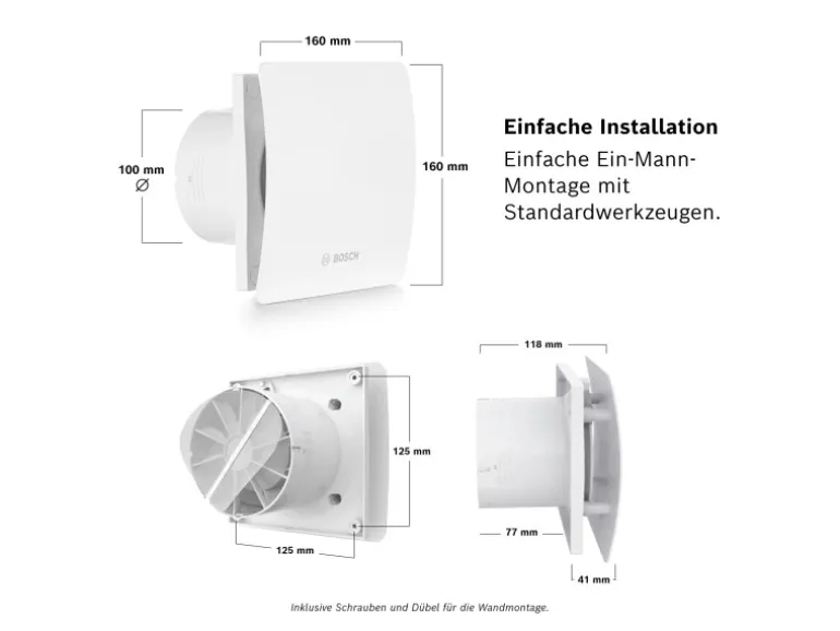 Der weiß-glänzende Bosch Badlüfter Fan 1500 W 100 hat einen Durchmesser von 100 mm. Er verfügt über eine Lichtschalter-Aktivierung und kann dank der mitgelieferten Schrauben und Dübel auf der Wand montiert werden.