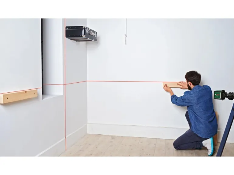 Mit seinem Selbstnivellierungsbereich von +/- 4° projiziert er ein perfektes Laserkreuz zum einfachen und präzisen Ausrichten von Gegenständen an die Wand, selbst wenn das Werkzeug auf einer leicht unebenen Oberfläche steht. Das Werkzeug wird mit der Universalklemme MM2 und einer Adapterplatte zur einfachen, vielseitigen Positionierung geliefert.