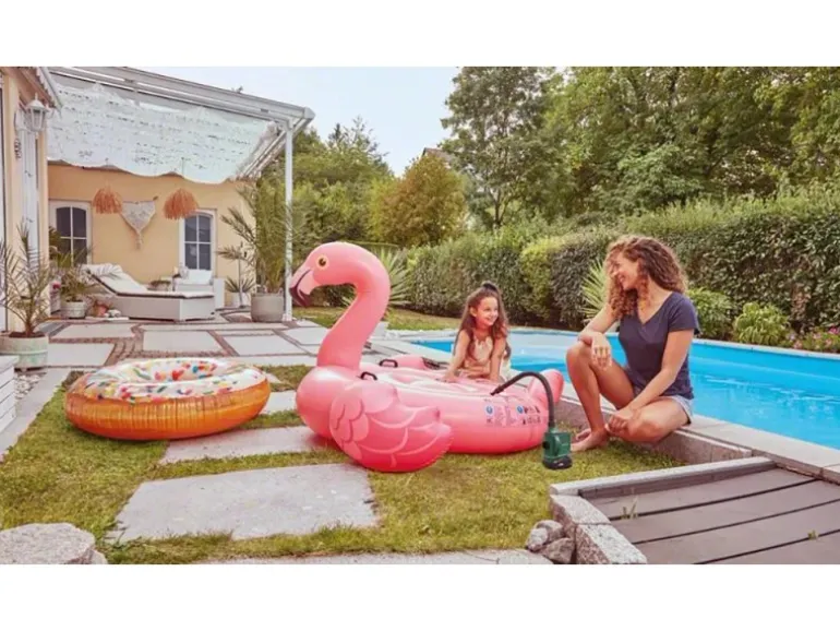 Diese handliche Luftpumpe ist im Nu startklar und pumpt mit einem max. Luftdurchsatz von 530 l/min schnell Poolspielzeuge und Planschbecken auf, damit der Spaß losgehen kann.