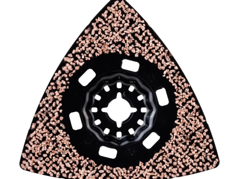 Der Schleifteller Starlock AVZ 90 RT2 Carbide RIFF bietet eine besonders hohe Lebensdauer beim Entfernen von Mörtel und Fliesenkleber. Der Teller ist für hohe die Verschleißfestigkeit und somit außergewöhnlich lange Nutzungsdauer mit hochwertigem Hartmetallkorn der Körnung 20 besetzt. Ein offener Besatz ermöglicht den aggressiven Materialabtrag ohne ein Zusetzen oder Ablagern, womit zusätzlich eine höhere Lebensdauer des Tellers erzielt wird. Mit dem deltaförmigen Teller lassen sich auch schwer zugängliche Ecken erreichen. Dabei ist er ideal geeignet zum Entfernen von Mörtel und Fugenmörtel, Teppichkleberrückständen von mineralischen Oberflächen und zum Raspeln von Holz für grobe Formanpassungen. Es ist kompatibel mit allen Elektrowerkzeugen des Typs Starlock, Starlock Plus und Starlock Max sowie allen gängigen Multifunktionswerkzeugen. Darüber hinaus ermöglicht das Aufnahmesystem durch seine dreidimensionale enge Passung, eine maximale Kraftübertragung zwischen Maschine und Zubehör.