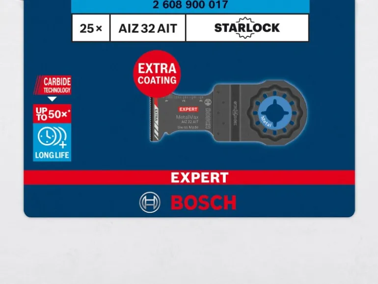 Das Bosch Tauchsägeblatt für Metall hält bis zu 50-mal länger als ein Bosch AIZ 20 AB Blatt – Wenn gehärtete Schrauben rosten oder auf andere Weise stecken bleiben, besteht die einzige Option darin, sie flach an der Oberfläche abzuschneiden. Der MetalMax macht auch in gehärtetem Metall einen perfekten bündigen Schnitt. Mit seiner herausragenden Langlebigkeit ist es das perfekte Zubehör für Handwerker, die harte Materialien mit einem Multifunktionswerkzeug schneiden möchten. Der MetalMax ist das Neueste, was die Bosch Carbide Technology zu bieten hat. Die Zähne bestehen nicht nur aus einer extrem harten Metallleiste, die sogar Edelstahl schneiden kann, sie verfügen auch über eine Hightech-Zusatzbeschichtung für maximale Langlebigkeit. Die gerade Schneidkante ist zum Ablängen optimiert, da sie weniger zum Wegrutschen auf Schrauben und Rohren neigt. Sie haben gesehen, wie mühelos das Multifunktionswerkzeug in und durch Holz sägen kann: Mit dem Bosch MetalMax Blatt für Multifunktionswerkzeuge kann Metall genauso zersägt werden. Es sägt sogar mühelos gehärtete Fensterschrauben und Armierungen. Starlock-Aufnahme für optimale Kraftübertragung und bequemen Blattwechsel innerhalb von 3 Sekunden.