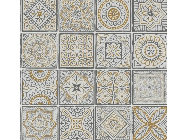 Bricoflor Orientalische Tapete in Fliesenoptk Grau Gold Ideal für Wohnzimmer und Küche Vliestapete mit Fliesen im Boho Chic