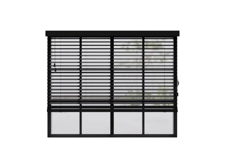 Robuste 50mm Lamellen mit farblich passender Holz-Blende am Stahl-Oberprofil.