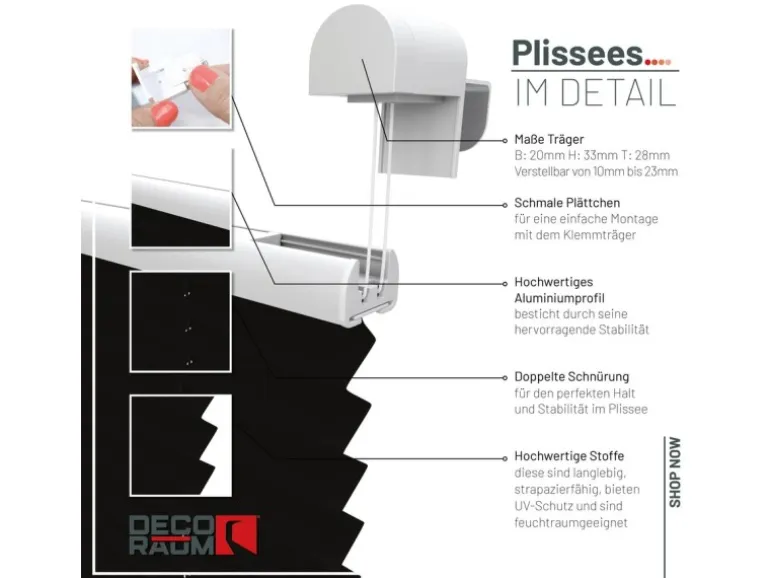 Setzen Sie auf stilvollen Sicht- und Sonnenschutz mit unserem hochwertigen Plissee im praktischen Fixmaß – ideal für Fenster sowie Balkon- und Terrassentüren.
