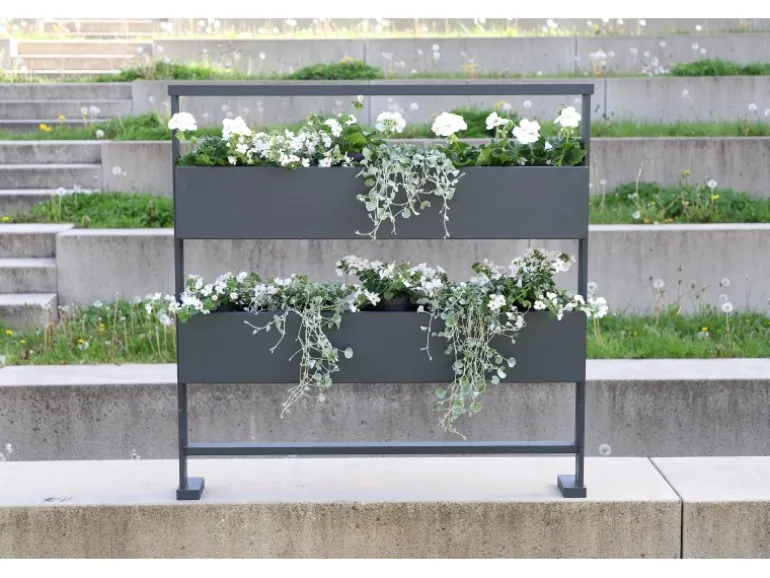 Mit den Abmessungen von 100 cm x 100 cm ermöglicht das Vario Grundgestell die Ausstattung mit vier verschiedenen Variationen: Glas, Streckgitter, Blumenkasten oder PV Solarmodul, die alle flexibel kombinierbar sind.