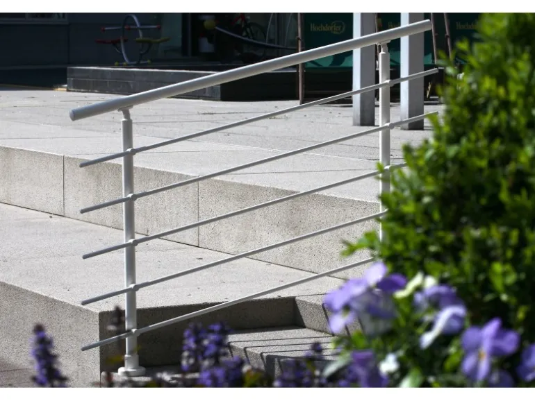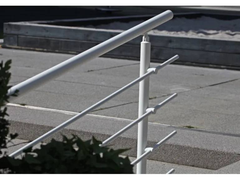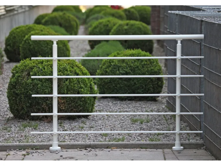 Die Höhe der 2 Stützen beträgt 1130 mm mit jeweils 5 Rundstabhaltern und 5 Rundstäben à Ø 16 mm und 1500 mm Länge. Der Handlauf hat eine Länge von 1500 mm sowie Ø 40 mm. Die Montage erfolgt seitlich. Im Lieferumfang enthalten sind neben 2 Stützen, 5 Rundstabhaltern, 1 Handlauf und 5 Rundstäben ebenfalls 2 Endkappen für den Handlauf und 10 Endkappen für die Rundstäbe. Weiterhin beinhaltet das Set Verbinder für den Handlauf sowie die Rundstäbe.