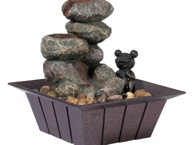 Der Springbrunnen ist ca. 20 cm x 20 cm x 21,5 cm groß und hat einen Energieverbrauch von 3,5 W. Neben dem Brunnen sind 200 g Ziersteine, ein ca. 1,6 m langes Netzkabel inkl. Pumpe und eine ausführliche Bedienungsanleitung im Lieferumfang enthalten.