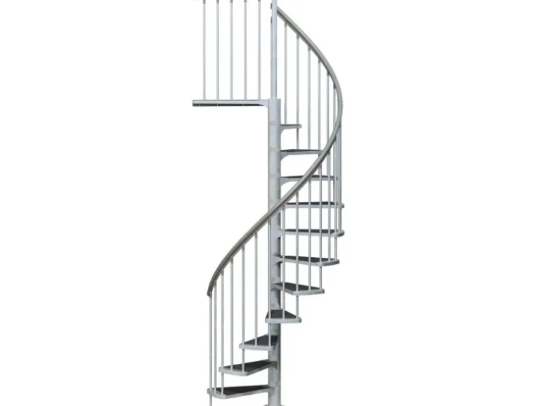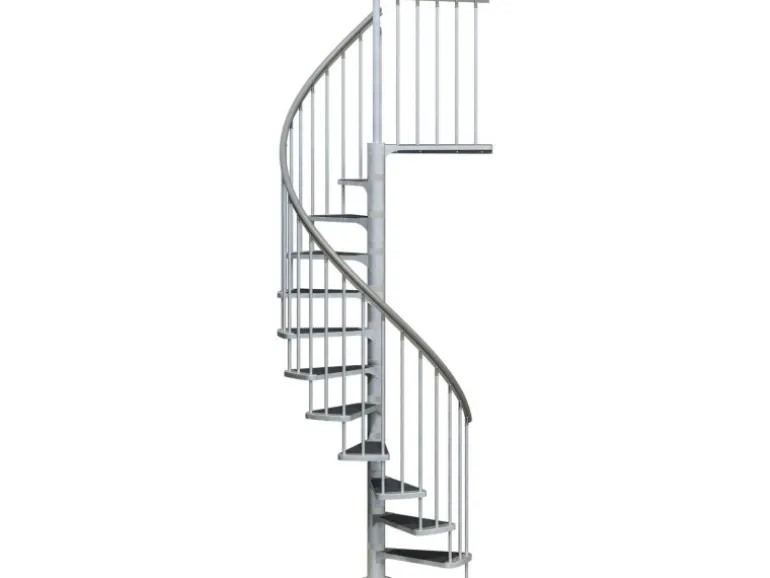 Besonders einbaufreundlich präsentiert sich dieses Außentreppenmodell durch ein teleskopierbares Podest: Es lässt sich am Spindelrohr verschieben, bis es der gewünschten Gesamthöhe exakt entspricht. Die bereits eingehängten Stufen müssen danach nur noch gleichmäßig verteilt (Steigungshöhe von 20,5 bis 23,5 cm) und festgeschraubt werden, dabei kann die Treppe sowohl links- als auch rechtsgewendelt aufgebaut werden. Mit 11 Stufen und einem Podest können Geschosshöhe von 246 – 282 cm erreicht werden. Treppendurchmesser 155 cm