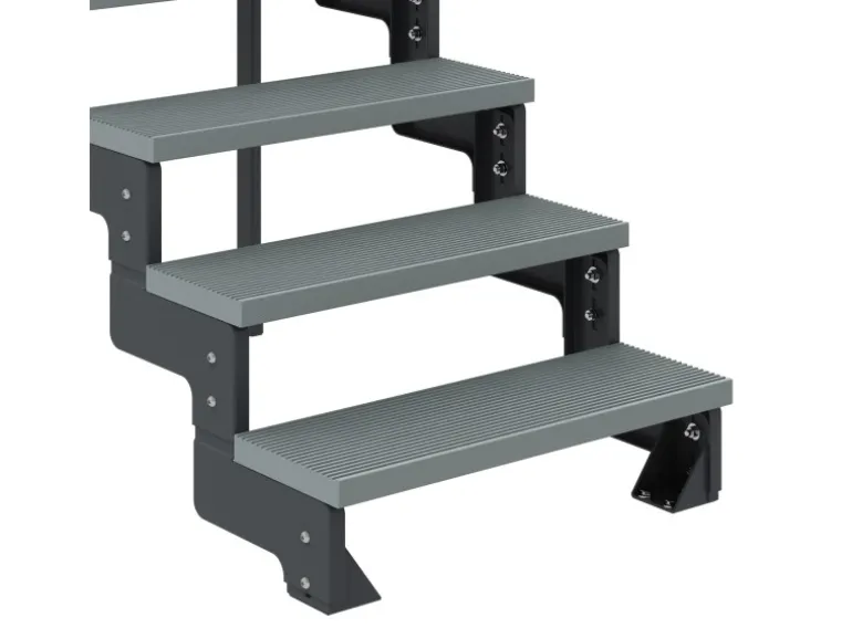 Die grauen und 80 cm breiten Trimax-Stufen sind verrottungsfest, frostsicher, resistent gegen Pilz- und Insenktenberall. Sie lassen sich leicht mit einem Hochdruckreiniger säubern und sind barfuß begehbar.