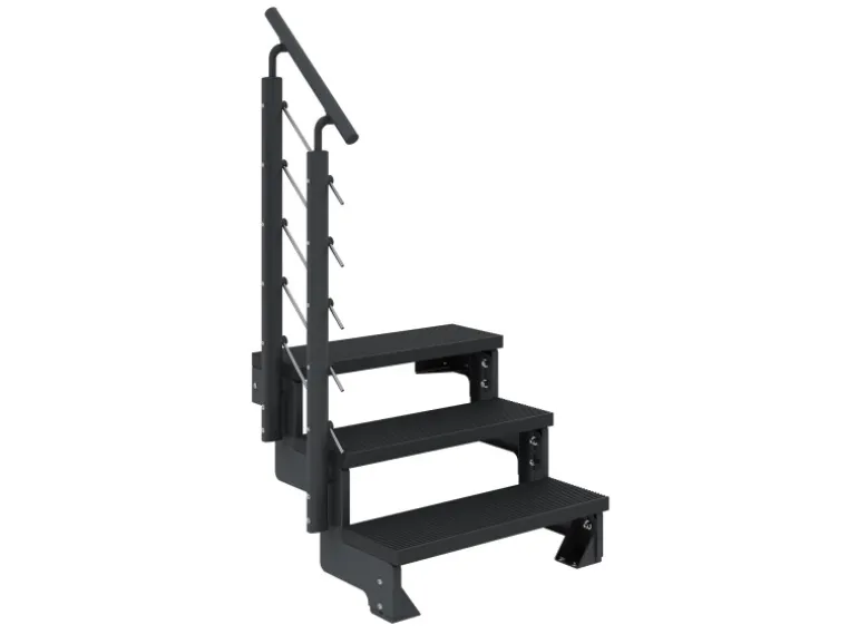 Die die anthrazitfarbenen und 80 cm breiten Trimax-Stufen sind verrottungsfest, frostsicher, resistent gegen Pilz- und Insenktenberall. Sie lassen sich leicht mit einem Hochdruckreiniger säubern und sind barfuß begehbar.