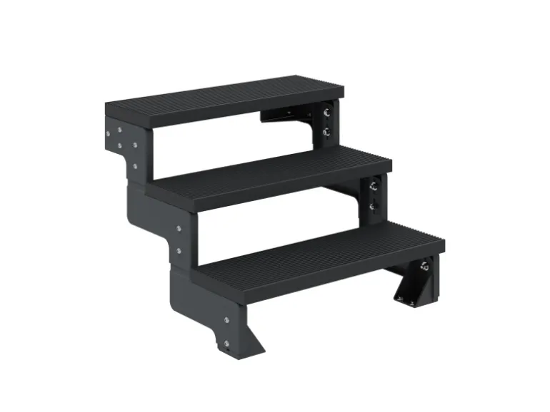 Die die anthrazitfarbenen und 80 cm breiten Trimax-Stufen sind verrottungsfest, frostsicher, resistent gegen Pilz- und Insenktenberall. Sie lassen sich leicht mit einem Hochdruckreiniger säubern und sind barfuß begehbar.