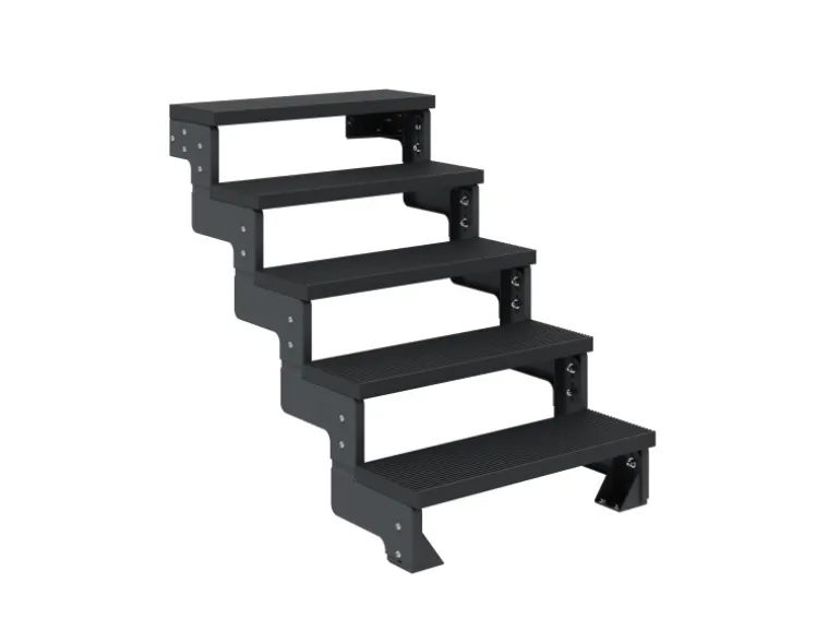 Die die anthrazitfarbenen und 80 cm breiten Trimax-Stufen sind verrottungsfest, frostsicher, resistent gegen Pilz- und Insenktenberall. Sie lassen sich leicht mit einem Hochdruckreiniger säubern und sind barfuß begehbar.