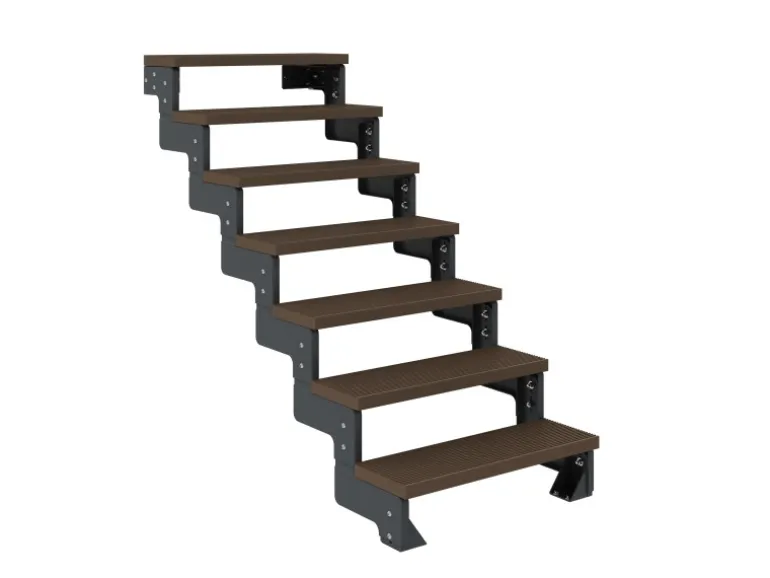 Die dunkelbraunen und 100 cm breiten Trimax-Stufen sind verrottungsfest, frostsicher, resistent gegen Pilz- und Insenktenberall. Sie lassen sich leicht mit einem Hochdruckreiniger säubern und sind barfuß begehbar.