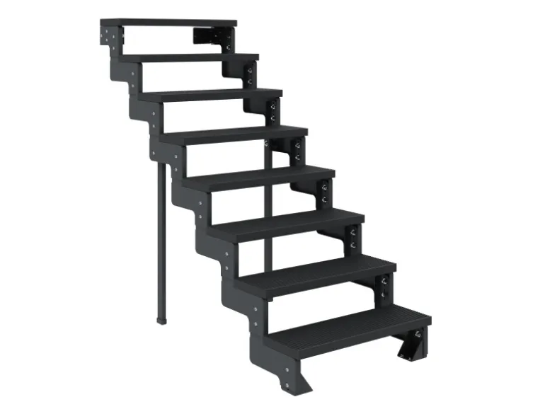 Die die anthrazitfarbenen und 80 cm breiten Trimax-Stufen sind verrottungsfest, frostsicher, resistent gegen Pilz- und Insenktenberall. Sie lassen sich leicht mit einem Hochdruckreiniger säubern und sind barfuß begehbar.