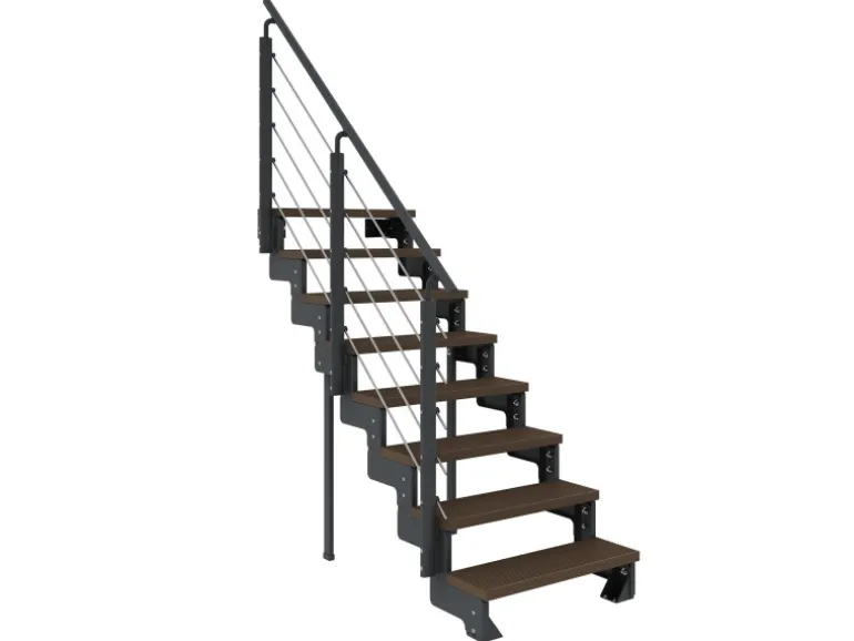 Mit 8 Stufen werden Höhen von 144 bis 176 cm überbrückt. Die Anpassung erfolgt durch das Einstellen der Steigungshöhe pro Stufe.