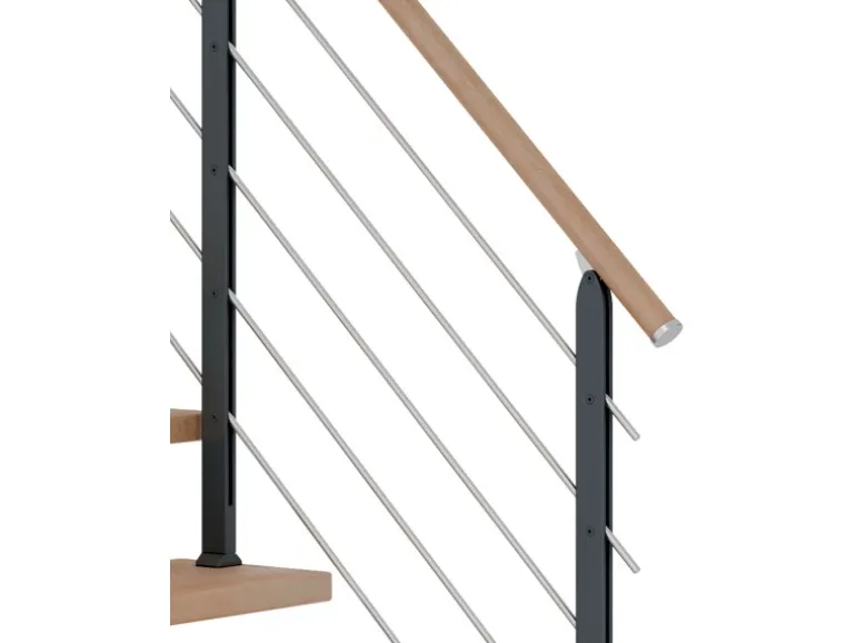 Ausgestattet ist das Modell mit einem einseitigen Designgeländer, mit Metallpfosten, mitlaufenden Edelstahlstäben und einem Holzhandlauf