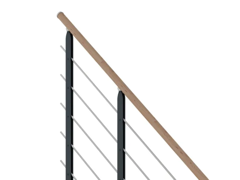 – Designgeländer machen sie zu einer regelrechten Raumskulptur. Mit 1/4gewendeltem Treppenlauf und 13 geölten Eiche anthrazit-Stufen ist diese Ausführung für Geschosshöhen von 259 – 315 m geeignet. Die Metallkomponenten sind anthrazit pulverbeschichtet.