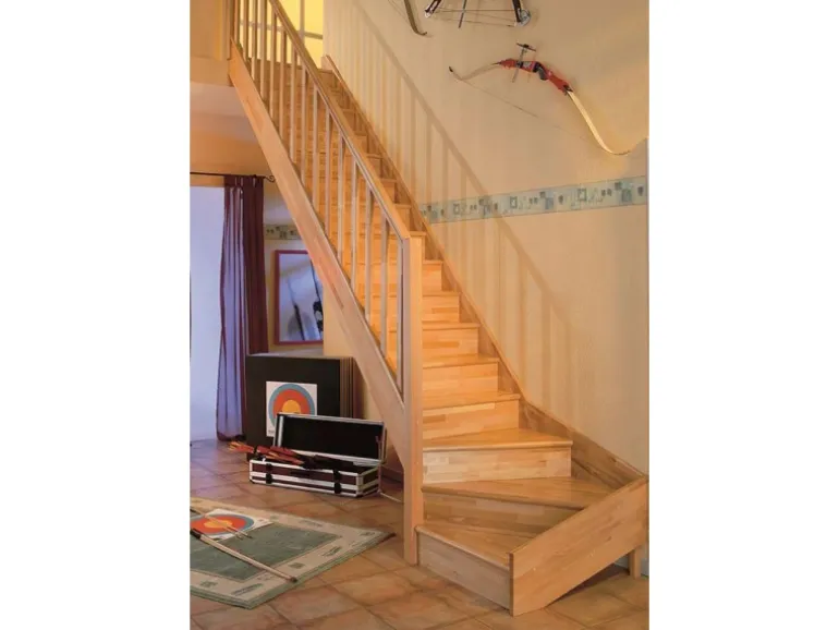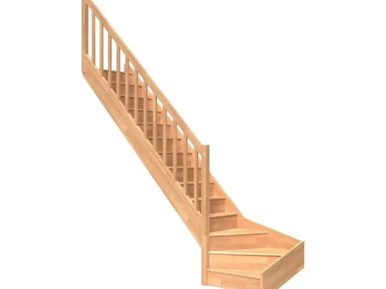 Die Treppe wird inklusive einem einseitigem Holzgeländer mit rechteckigen Geländerstäben geliefert.