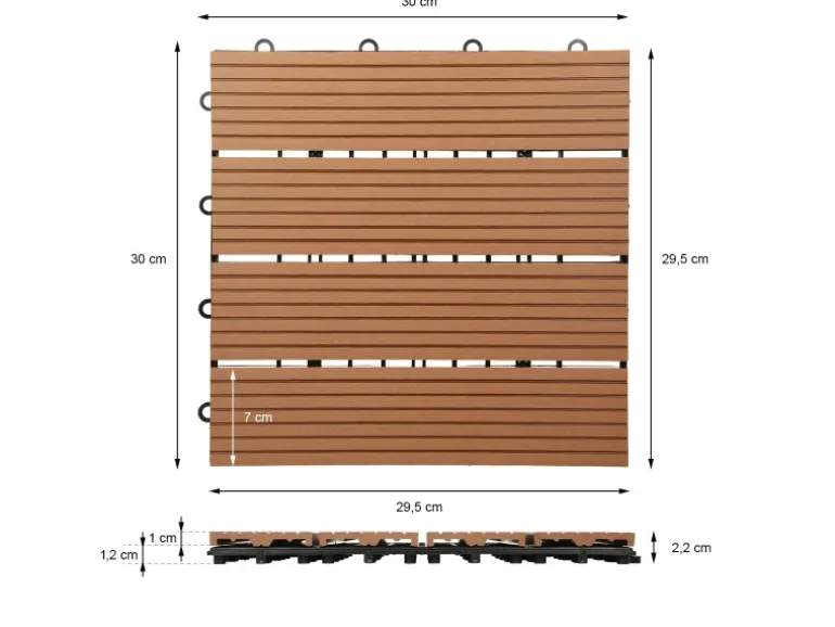 Lieferumfang: 1 m² WPC-Fliesen Hellbraun Technische Daten: Material: WPC (Holz-Kunststoff-Verbundwerkstoff) Unterkonstruktion: Drainageboden aus Polypropylen Farbe: Hellbraun Maße (L x B): ca. 30 x 30 cm (pro m² sind 11 Fliesen notwendig) Höhe: ca. 2,2 cm Gewicht je Fliese: 850 g Verlegeart: Stecksystem (Klicksystem) Eigenschaften: Moderne und edle Optik Träger mit Drainage für Wasserablauf – rutschfest Splittert und reißt nicht Witterungsbeständig, UV-beständig, frostsicher und langlebig Klicksystem – spielend leicht zu verlegen Bei Umzug leicht zu demontieren Geeignet im Innen- und Außenbereich Aus Holzfaser (50 %) und Polymerfaser (höhere Steifigkeit im Gegensatz zu Vollholz) individuell anpassbar Beschreibung: Diese Terrassenfliese mit intelligentem Stecksystem ist eine stilvolle und praktische Lösung für den Balkon, die Terrasse , den Garten, ins Badezimmer und in den Sauna- und Poolbereich. Die Terrassenfliesen bestehen aus hochwertigem WPC-Material und sind daher sehr wetterbeständig. Außerdem sind sie rutschfest, splittern und reißen nicht. Die Terrassenfliesen sind pflegeleicht und verleihen Ihrer Terrasse ein sauberes und gepflegtes Aussehen. Das WPC ist ein thermoplastischer Verbundwerkstoff und setzt sich zusammen aus Holz, Kunststoff und Additiven. Die Kombination dieser Materialien ermöglicht eine hohe Beständigkeit und die optischen Eigenschaften eines Naturproduktes.