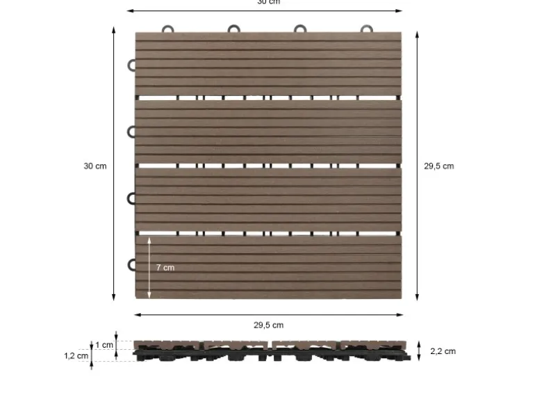 Lieferumfang: 2 m² WPC-Fliesen Dunkelbraun Technische Daten: Material: WPC (Holz-Kunststoff-Verbundwerkstoff) Unterkonstruktion: Drainageboden aus Polypropylen Farbe: Dunkelbraun Maße (L x B): ca. 30 x 30 cm (pro m² sind 11 Fliesen notwendig) Höhe: ca. 2,2 cm Gewicht je Fliese: 850 g Verlegeart: Stecksystem (Klicksystem) Eigenschaften: Moderne und edle Optik Leichte Montage dank Stecksystem Aus Holzfaser (50 %) und Polymerfaser (höhere Steifigkeit im Gegensatz zu Vollholz) frostsicher, witterungsbeständig, nahezu feuchtigkeitsresistent rutschfest, splittert und reißt nicht individuell anpassbar Beschreibung: Diese Terrassenfliese mit intelligentem Stecksystem ist eine stilvolle und praktische Lösung für den Balkon, die Terrasse , den Garten, ins Badezimmer und in den Sauna- und Poolbereich. Die Terrassenfliesen bestehen aus hochwertigem WPC-Material und sind daher sehr wetterbeständig. Außerdem sind sie rutschfest, splittern und reißen nicht. Die Terrassenfliesen sind pflegeleicht und verleihen Ihrer Terrasse ein sauberes und gepflegtes Aussehen. Das WPC ist ein thermoplastischer Verbundwerkstoff und setzt sich zusammen aus Holz, Kunststoff und Additiven. Die Kombination dieser Materialien ermöglicht eine hohe Beständigkeit und die optischen Eigenschaften eines Naturproduktes.