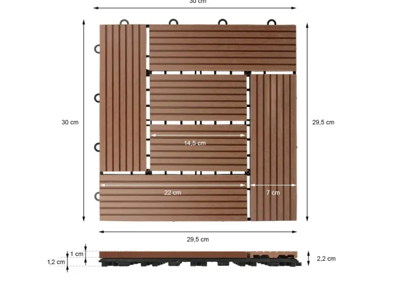 Lieferumfang: 3 m² WPC-Fliesen Hellbraun Mosaik Technische Daten: Material: WPC (Holz-Kunststoff-Verbundwerkstoff) Unterkonstruktion: Drainageboden aus Polypropylen Farbe: Hellbraun Maße (L x B): ca. 30 x 30 cm (pro m² sind 11 Fliesen notwendig) Höhe: ca. 2,2 cm Gewicht je Fliese: 850 g Verlegeart: Stecksystem (Klicksystem) Eigenschaften: Moderne und edle Optik Träger mit Drainage für Wasserablauf – rutschfest Splittert und reißt nicht Witterungsbeständig, UV-beständig, frostsicher und langlebig Klicksystem – spielend leicht zu verlegen Bei Umzug leicht zu demontieren Geeignet im Innen- und Außenbereich Aus Holzfaser (50 %) und Polymerfaser (höhere Steifigkeit im Gegensatz zu Vollholz) individuell anpassbar Beschreibung: Diese Terrassenfliese mit intelligentem Stecksystem ist eine stilvolle und praktische Lösung für den Balkon, die Terrasse , den Garten, ins Badezimmer und in den Sauna- und Poolbereich. Die Terrassenfliesen bestehen aus hochwertigem WPC-Material und sind daher sehr wetterbeständig. Außerdem sind sie rutschfest, splittern und reißen nicht. Die Terrassenfliesen sind pflegeleicht und verleihen Ihrer Terrasse ein sauberes und gepflegtes Aussehen. Das WPC ist ein thermoplastischer Verbundwerkstoff und setzt sich zusammen aus Holz, Kunststoff und Additiven. Die Kombination dieser Materialien ermöglicht eine hohe Beständigkeit und die optischen Eigenschaften eines Naturproduktes.