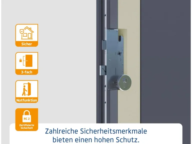 Die Isopro Secur verfügt serienmäßig über ein Mehrfachverriegelungsschloss, einen Profilsicherheitszylinder mit Bohr- und Ziehschutz und eine Rundrosette. Die einbruchhemmende Sicherheitsausstattung mit der zertifizierten Widerstandsklasse RC 2 sorgt für noch mehr Sicherheit in den eigenen vier Wänden. Jede Isopro Secur Haustür wird serienmäßig mit 5 Schlüsseln ausgeliefert.
