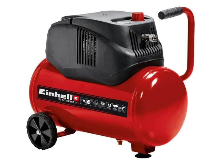 Der langlebige Kessel bietet einen Inhalt von 24 l, sodass genügend Luftreserven vorhanden sind. Außerdem braucht der Motor kein Öl, was ihn sehr wartungsarm macht. Dabei bringt der Motor eine Drehzahl von 15.000/min (Umdrehungen) und eine Ansaugleistung von 180 l pro Minute mit. Der Kompressor arbeitet mit einem maximalen Arbeitsdruck von 8 bar, der über den Druckminderer geregelt werden kann. Der Arbeitsdruck wird an der Schnellkupplung abgenommen und über ein Manometer angezeigt, sodass du stets eine hohe Kontrolle bei deinen Druckluftarbeiten hast. Im Betrieb erzeugt der Kompressor eine Lautstärke von 79 dB (A).