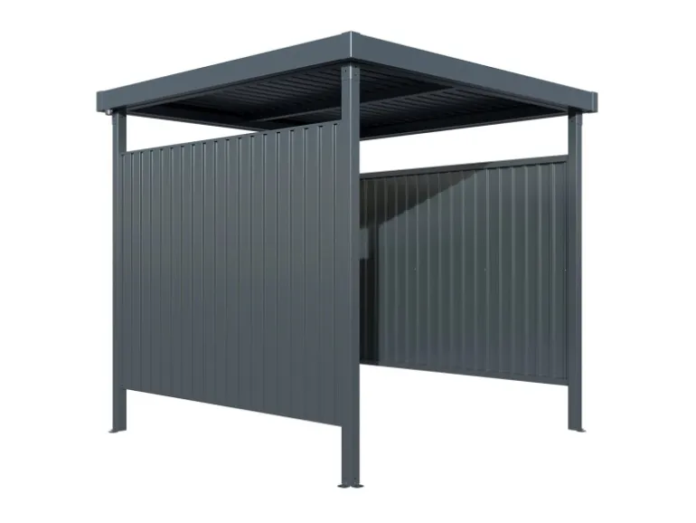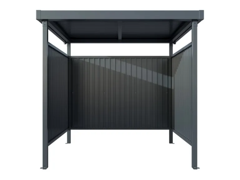 Das Flachdach verfügt über einen bereits integrierten Wasserablauf, während die Wasserablaufstutzen an der Rückseite des Unterstands angebracht sind.