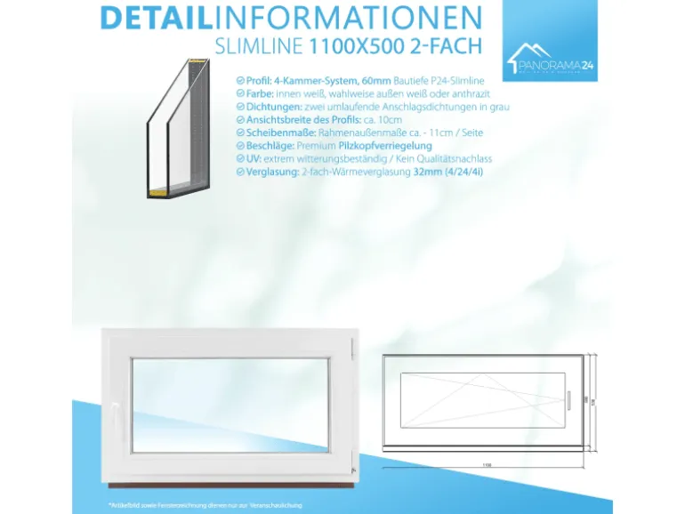 Framelux Kunststofffenster Slimline Weiß 2-Fach Verglasung 1100 x 500 mm Rechtsanschlag