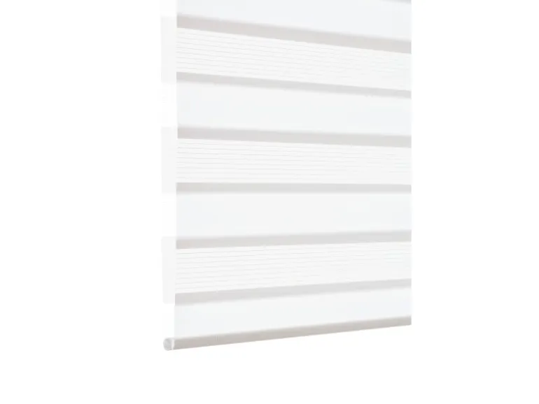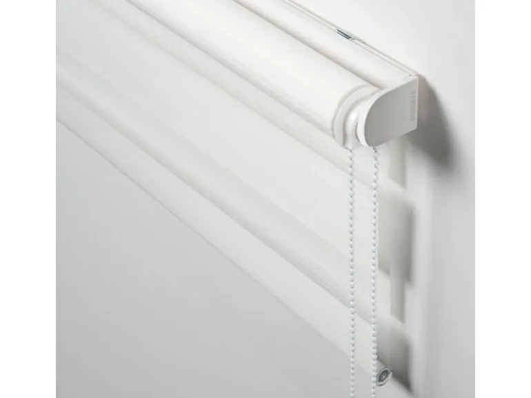 Der Stoff ist abwechselnd in transparenten und blickdichten Streifen gewebt und verläuft doppelt gegeneinander, wodurch interessante Effekte entstehen. Sicht- und Lichteinfall können dadurch sehr genau dosiert werden.