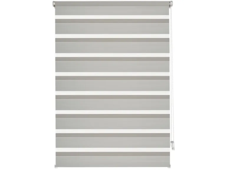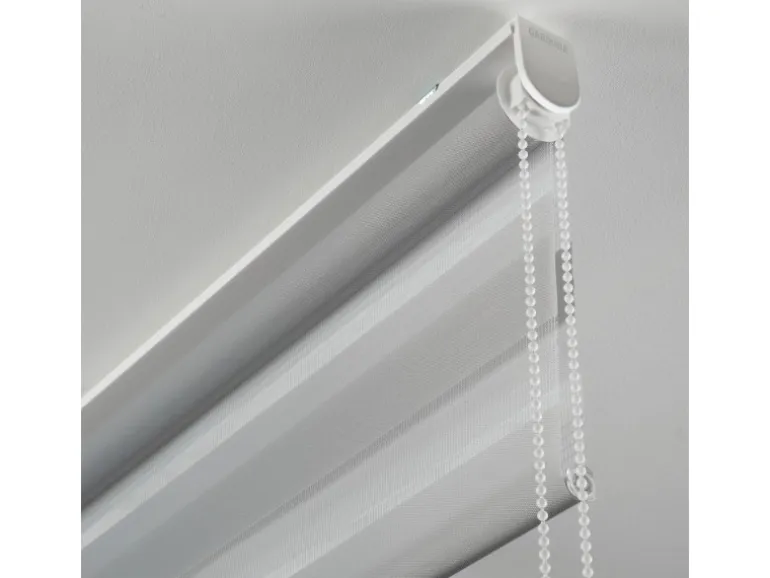 Der Stoff ist abwechselnd in transparenten und blickdichten Streifen gewebt und verläuft doppelt gegeneinander, wodurch interessante Effekte entstehen. Sicht- und Lichteinfall können dadurch sehr genau dosiert werden.