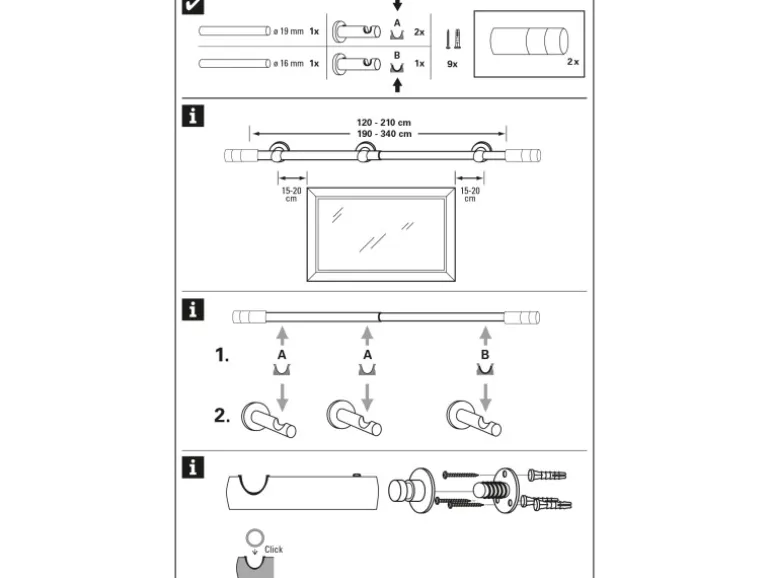 Das Gardinia Gardinenstangen-Set Elba ist aus robustem Metall hergestellt. Das Set ist inklusive 3 Trägern, Befestigungsmaterial und Endstücken, ohne Gardinenringe. Die Trägerlänge (Wandabstand der Gardinenstange) beträgt 7,5 cm.