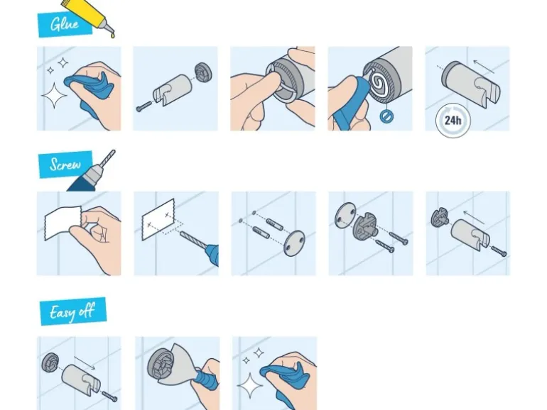 Nach einer Aushärtezeit von 24 Stunden sind Ihre Wandhalterungen sicher und fest installiert. Der Kleber haftet am besten auf Fliesen, Marmor, Stein, Glas, Beton, Kunststoff oder Metall (nicht geeignet für Tapeten, Putz und Kunststoffe wie PE, PTFE und PP).