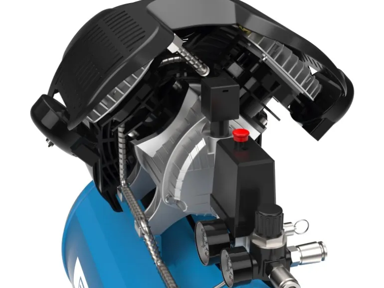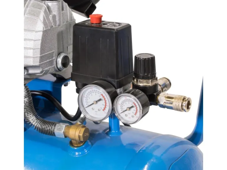 Dieser Kompressor ist mit einem ölgeschmierten 2-Zylinder-V-Aggregat mit Direktantrieb ausgestattet, was für eine effiziente Luftkompression sorgt. Ein integrierter Druckminderer ermöglicht ein leichtes Einstellen des Arbeitsdrucks nach Bedarf. Darüber hinaus verfügt der Kompressor über einen integrierten Luftfilter, um die Qualität der erzeugten Druckluft zu gewährleisten. Ein Doppelfuß mit Gummipuffern sorgt für einen sicheren Stand des Kompressors während des Betriebs.