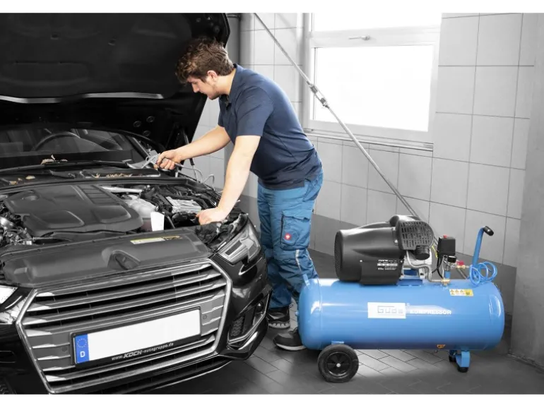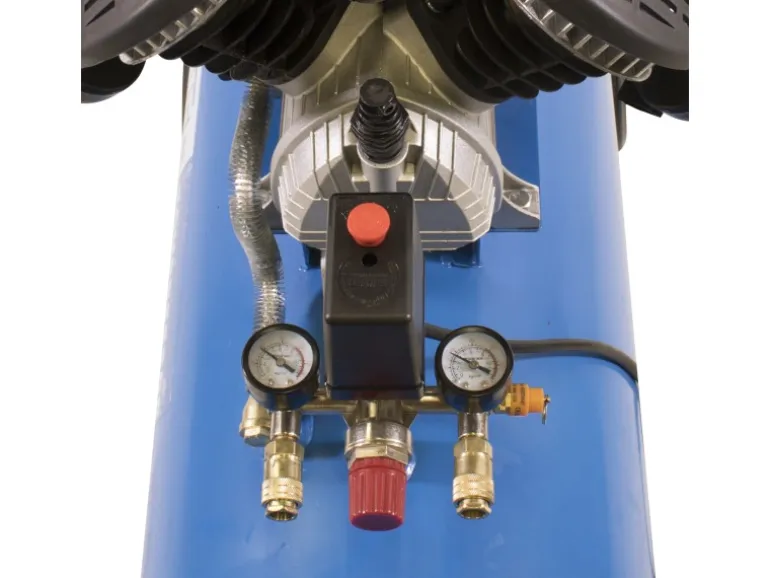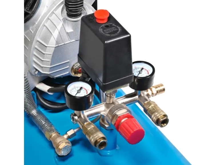Dieser Kompressor ist mit einem ölgeschmierten 2-Zylinder-V-Aggregat mit Direktantrieb ausgestattet, was für eine effiziente Luftkompression sorgt. Er verfügt über einen Druckschalter, der den Betrieb automatisch reguliert, um den gewünschten Arbeitsdruck aufrechtzuerhalten. Zwei Druckluftkupplungen ermöglichen die Verbindung mehrerer Werkzeuge oder Zubehörteile. Ein praktischer Transportgriff erleichtert die Mobilität und den Transport des Kompressors an verschiedene Einsatzorte.