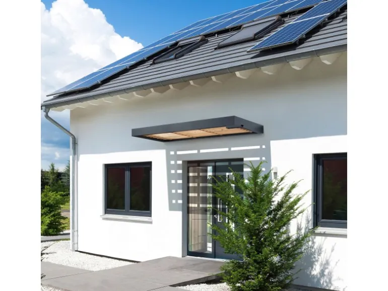 Das im Bauhaus-Stil gehaltene Vordach setzt mit dem schwarzen Rahmen einen eleganten Kontrast zu den Holzlamellen. Die Elemente aus Echtholz bringen eine warme Atmosphäre in jeden Hausgang.