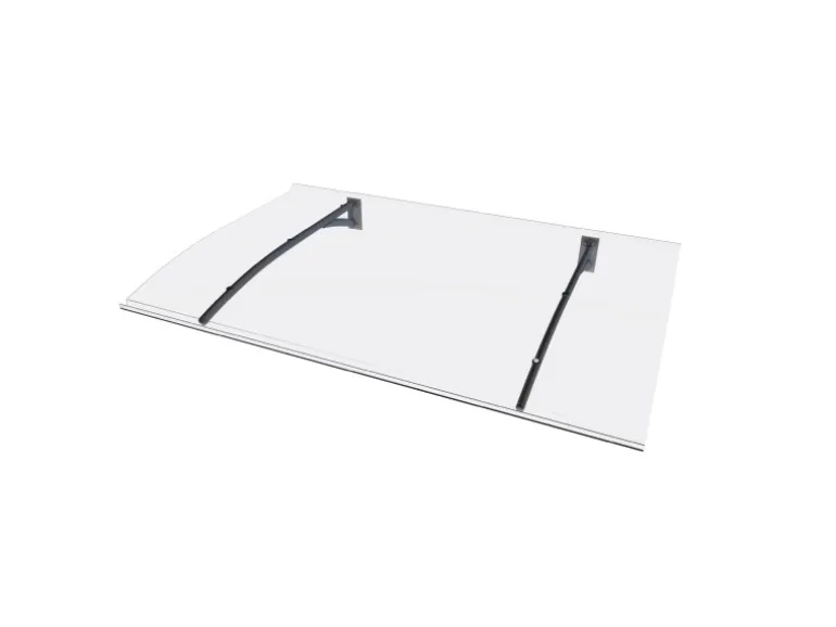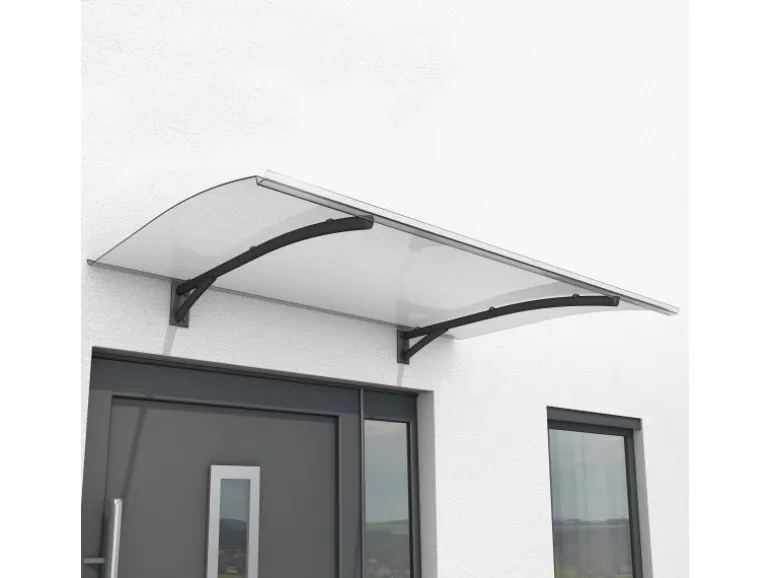 Die Hautürüberdachung ist durch die Kombination aus pulverbeschichtetem Aluminium und robustem Polycarbonat stabil und langlebig. Die gebogene Form und eine integrierte Regenrinne sorgen für einen gezielten Ablauf des Regenwassers.