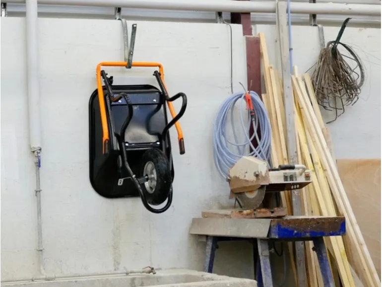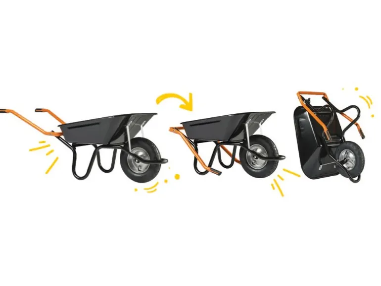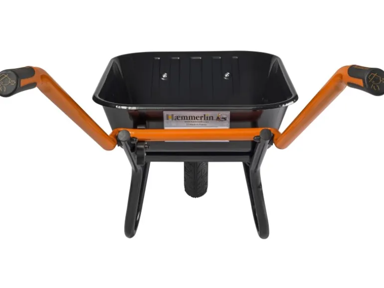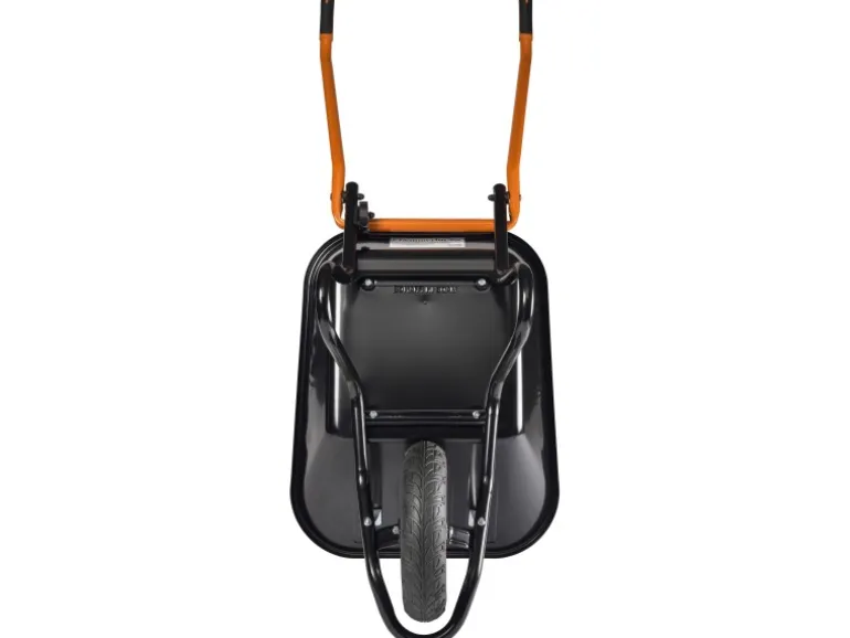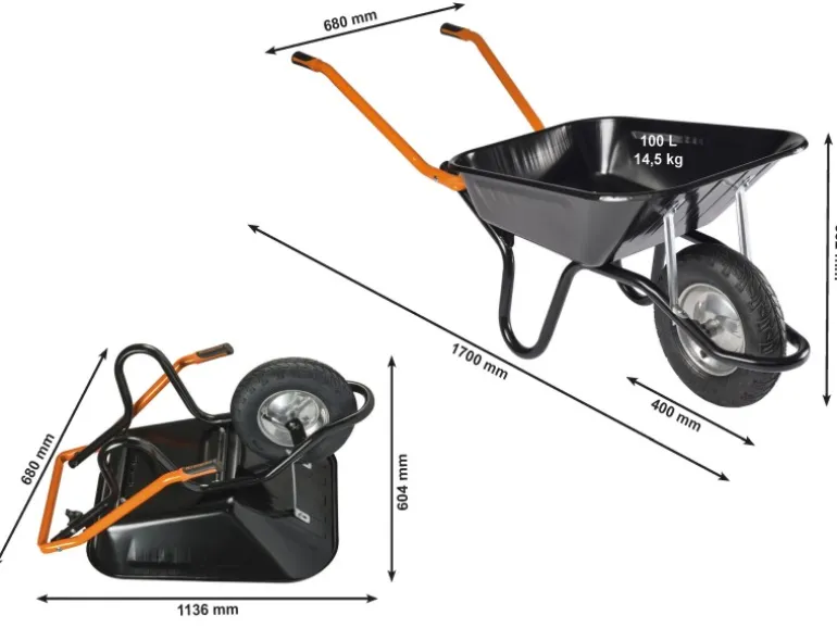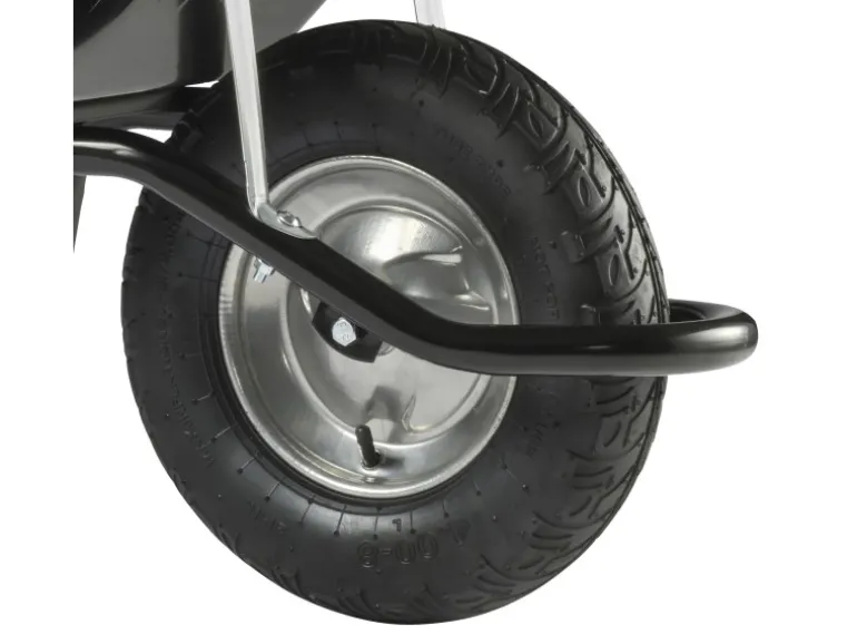 Die lackierte, schlagfeste 100 l Mulde ist mit Muldenabstützungen ausgestattet. Rutschsichere Softgriffe sorgen für eine optimale Handhabung. Das Luftrad mit Top-Profil auf Stahlfelge mit Kugellager federt Stöße ab und erleichtert das Überqueren von Hindernissen.