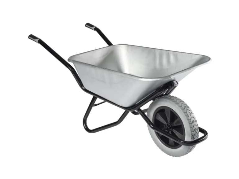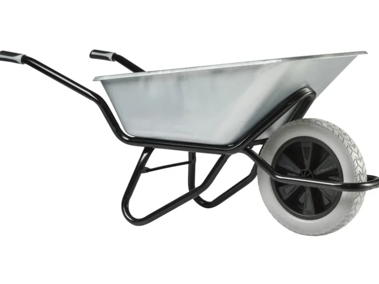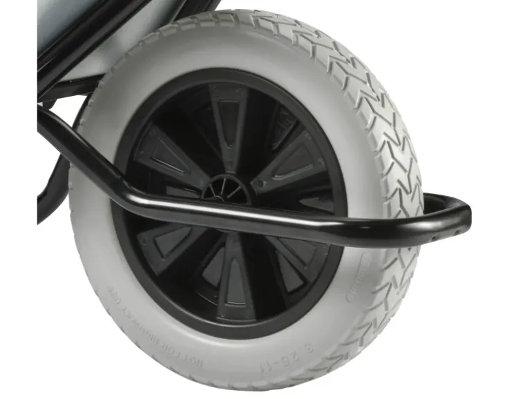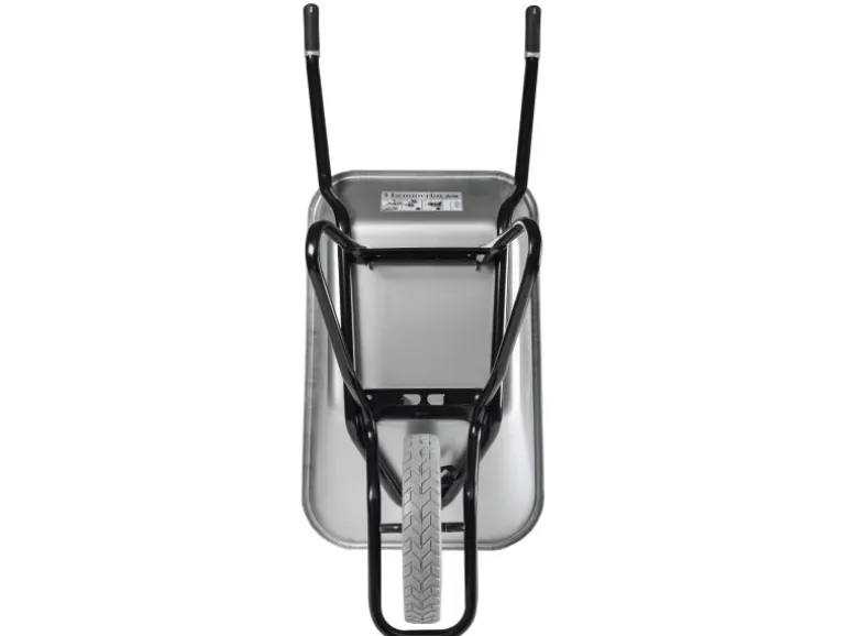 Rutschsichere 2-Komponenten-Griffe und ein pannensicheres PU-Rad mit breiter Lauffläche ergänzen die hochqualitative Ausstattung dieser schlagfesten Profischubkarre mit verzinkter 120-l-Tiefmulde.
