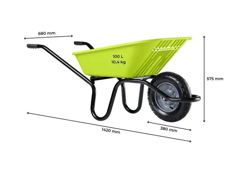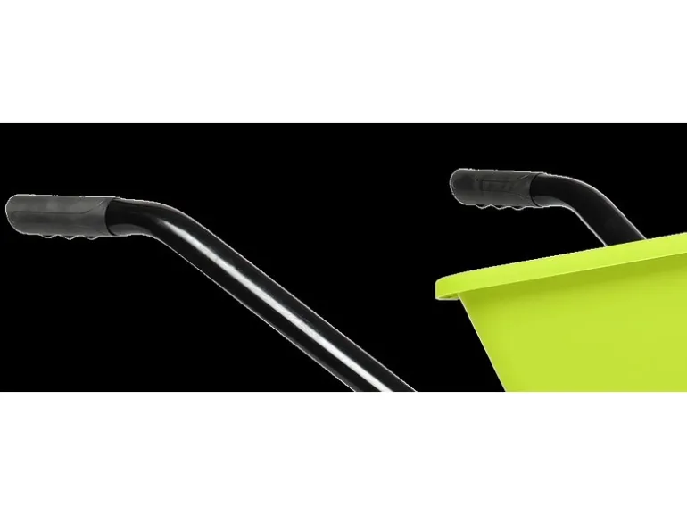 Ergonomische Griffe und ein hochwertiges Luftrad mit Schlauch ergänzen die Ausstattung dieser trendfarbigen Kunststoffmuldenschubkarre.
