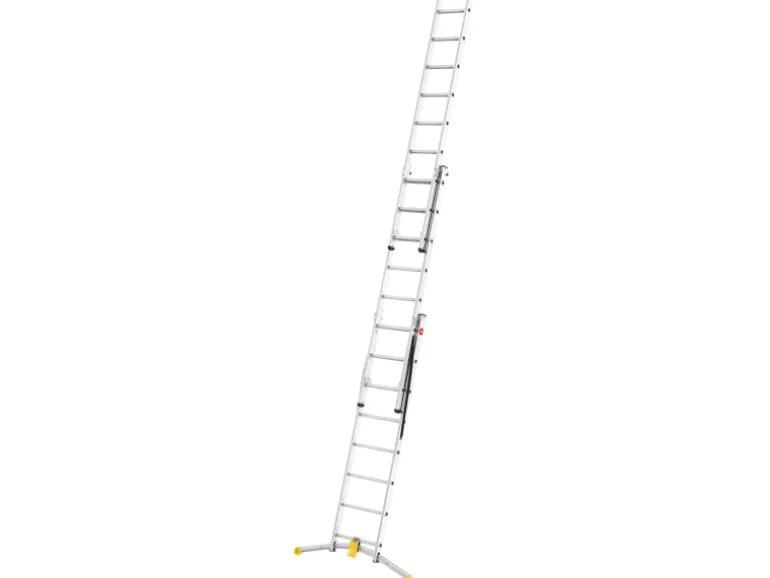 Ein Handgriff – und Sie haben aus der dreiteiligen Leiter eine zweiteilige Schiebeleiter gemacht. Oder eine einfache Anlegeleiter. Oder eine frei stehende Doppelsprossenleiter. Das LOT-System gleicht Bodenunebenheiten bis 10 cm aus. Die Einstellung dazu erfolgt per Fußpedal. Der Querbalken verfügt über großflächige, standsichere Tatzenfüße. Die Sprossen sind längs- und querprofiliert. Zusätzlich ist die Leiter mit schwarzen, reißfesten Spanngurten ausgestattet. Belastbar bis 150 kg.